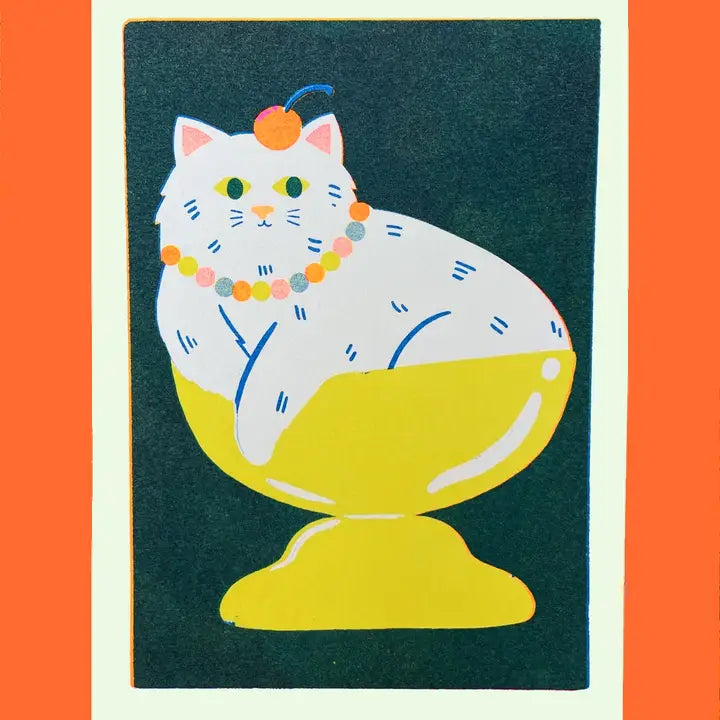 This 3 colour Risograph print created by Bristol based artist Naomi Wilkinson features a delightfully yummy looking white cat. Printed using soy based eco-friendly inks on recycled paper stock.