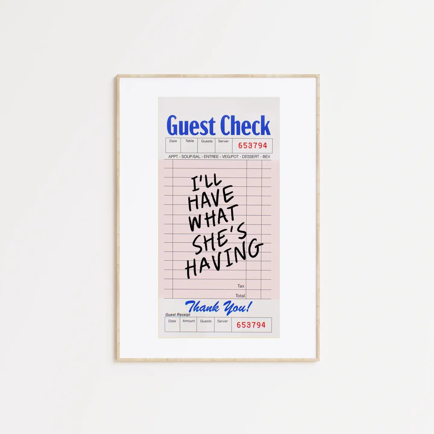 "I'll have what she's having" guest check When Harry Met Sally quote print.