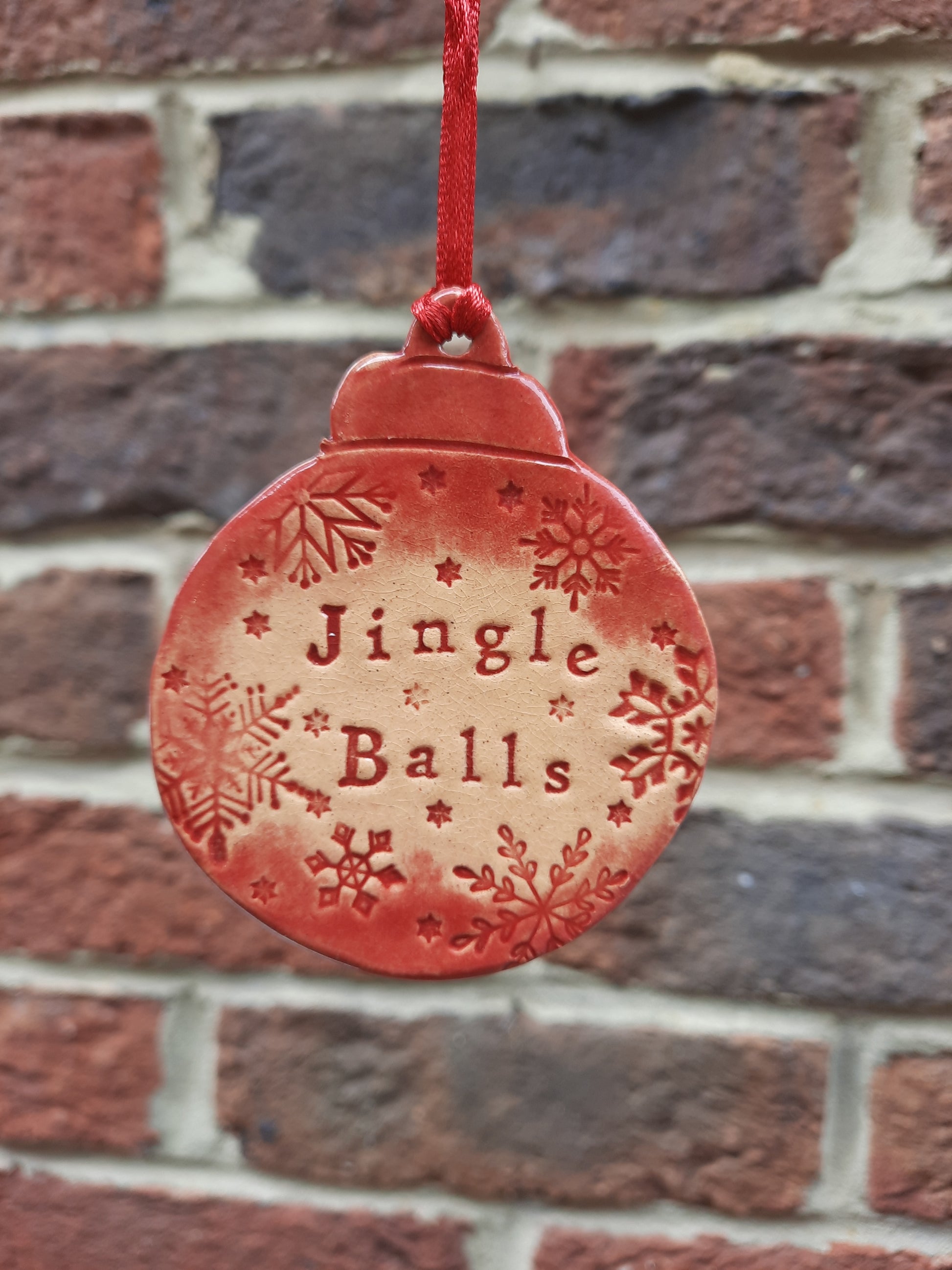 Imprinted with the words 'Jingle Balls' before firing to over 1000C. The decoration is then glazed red and fired again. Once it has cooled it is threaded with red ribbon, perfect for hanging up at Christmas!