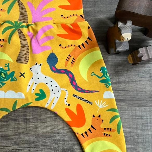 Super comfy with cuffed waist and legs, these harems are nice and baggy which makes them last ages and are great for cloth bums as well. They start off nice and baggy and as your little one grows they become more of a legging fit!