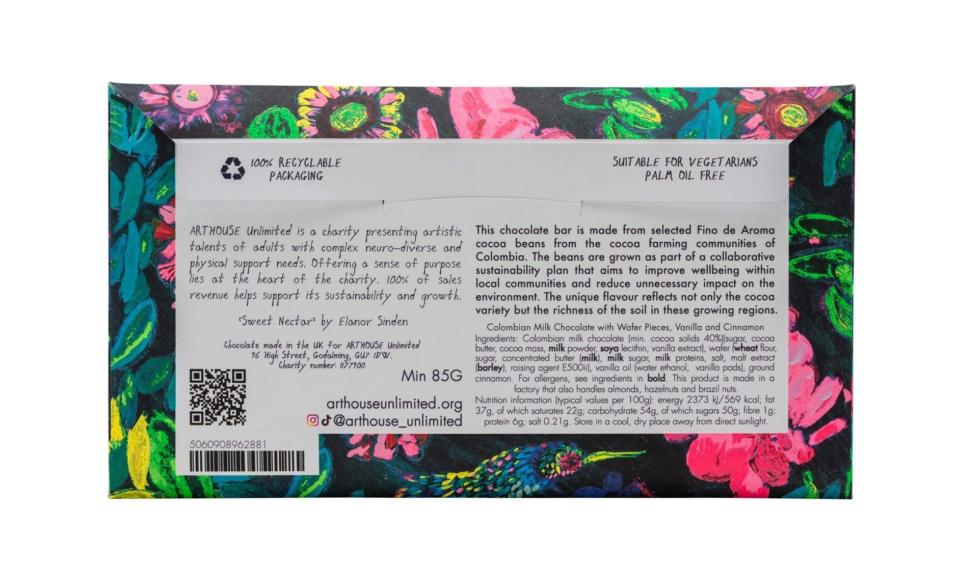 Each Arthouse flavour has it's own artwork created by adults with complex neurodiverse & physical support needs in supported art sessions. 100% of their wholesale sales go back into the ARTHOUSE Unlimited Charity.
