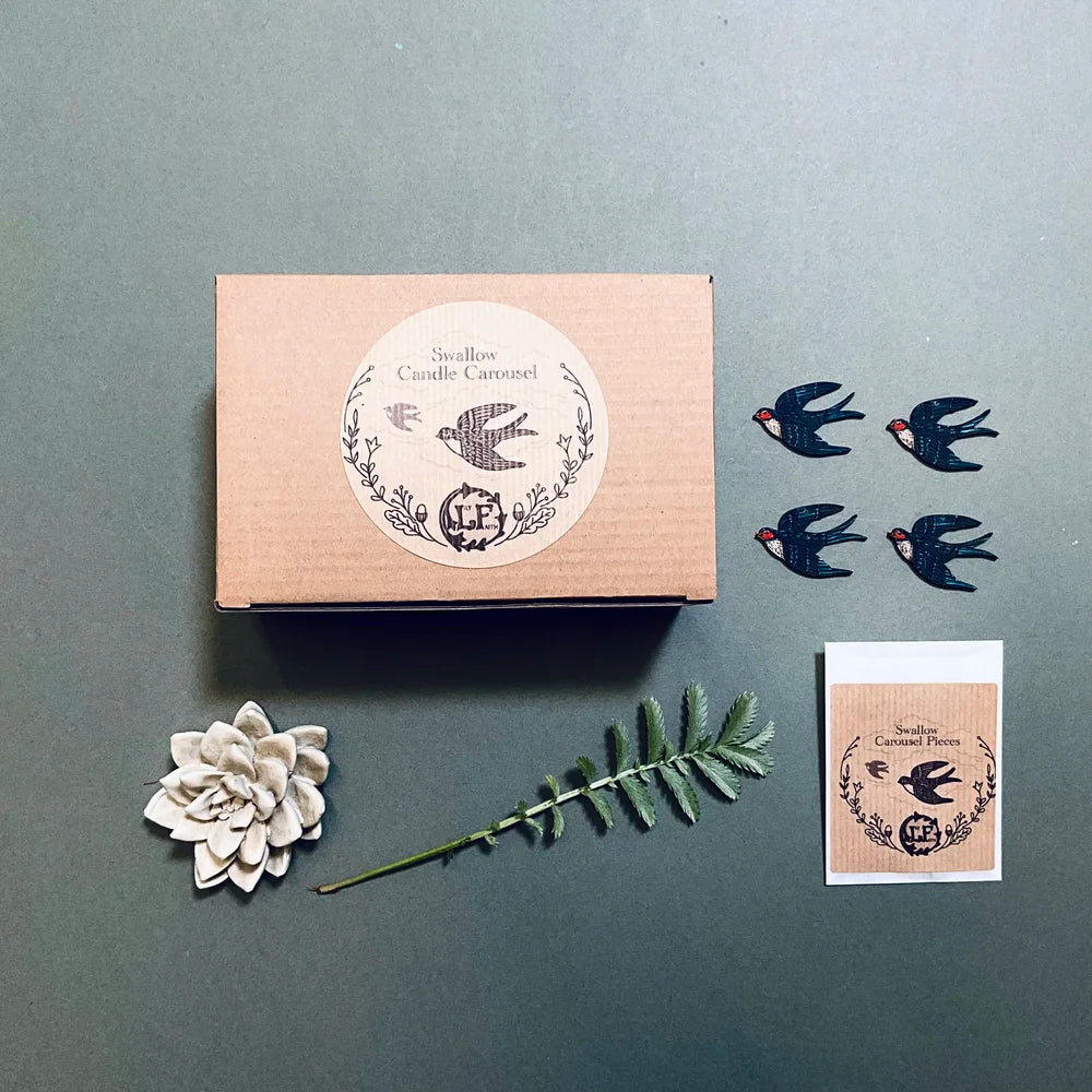 Each candle carousel has four laser etched wooden swallow ornaments which are intricately hand painted.